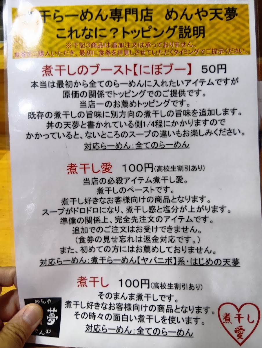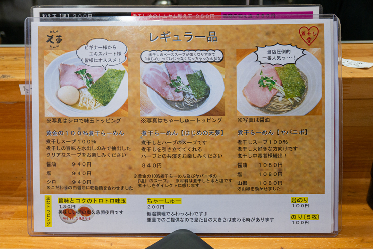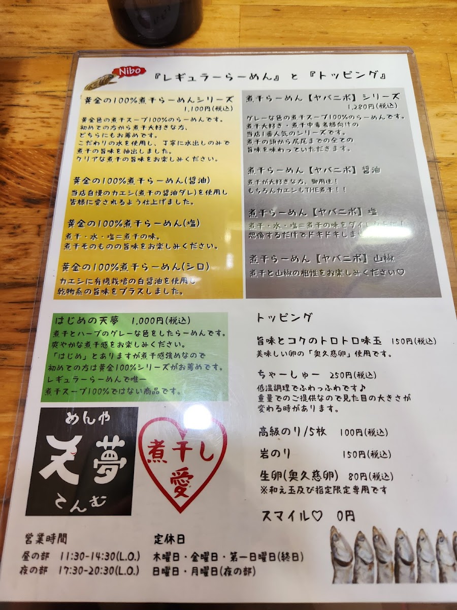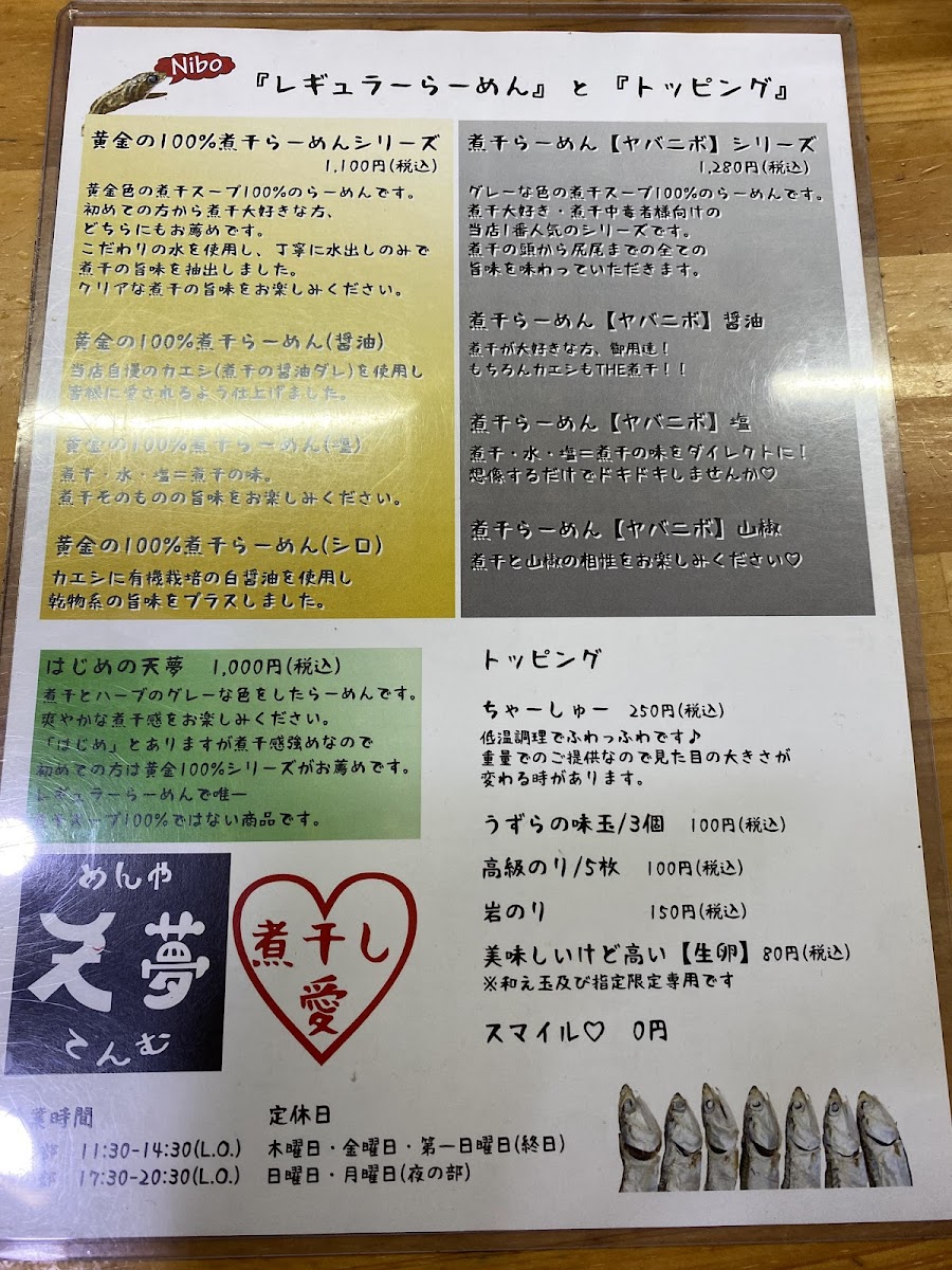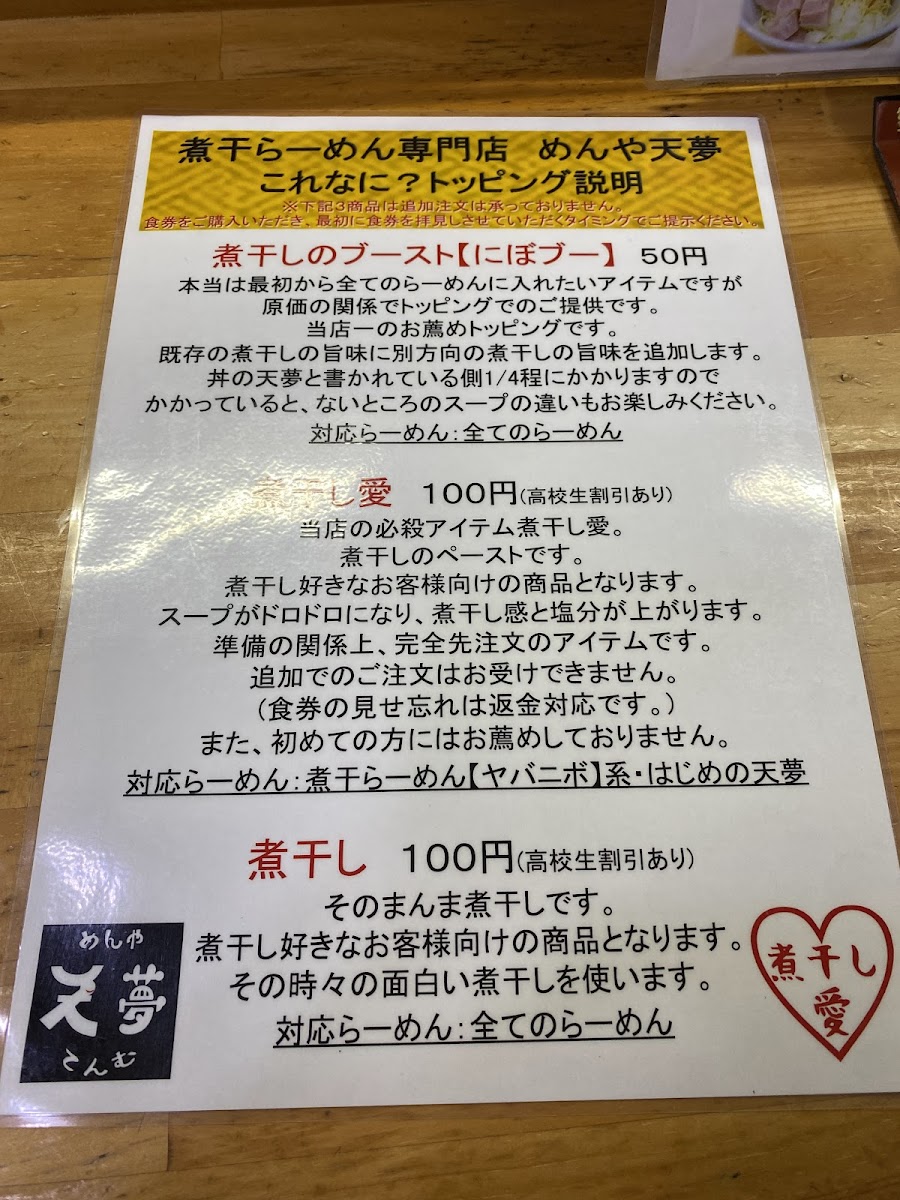 Introducing TENMU, a remarkable ramen haven nestled in Tochigi, Japan. Renowned for its unique 煮干しラーメン (Niboshi Ramen), this gem stands out as one of the few specialized ramen shops in the region. The flavor profile is exquisite, showcasing the rich umami of nibbled sardines that ramen enthusiasts rave about.